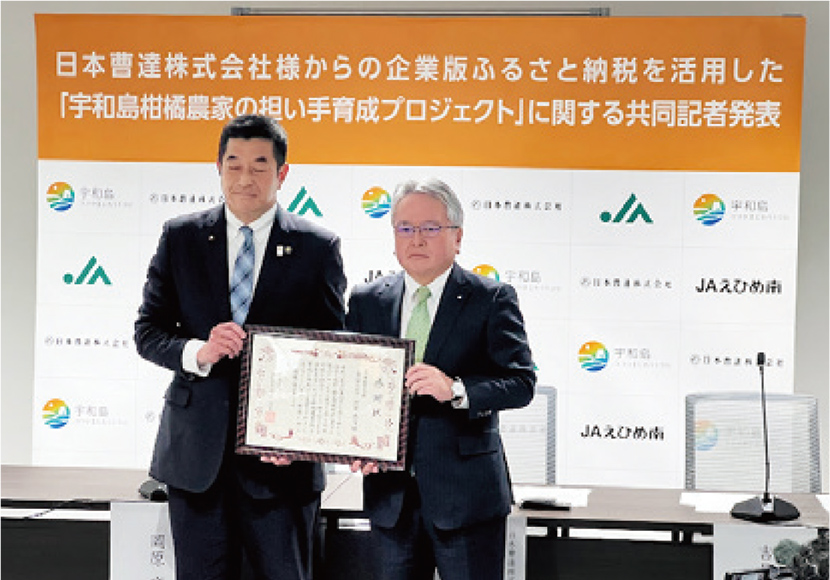 With a desire to contribute to sustainable agriculture and regional development alongside our communities, we donated ¥30 million (using the corporate hometown tax system) to the citrus fruit industry and projects tackling issues in the industry in Uwajima City in Ehime Prefecture, one of Japan’s leading citrus-producing regions.