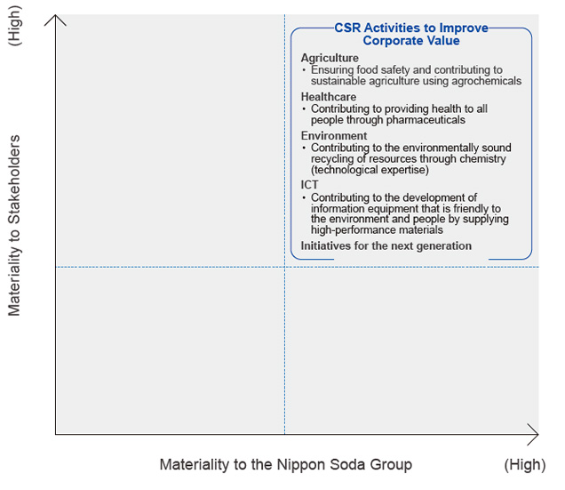 In May 2020, Nippon Soda Group identified materiality (important issues) in the four fields of Agriculture, Healthcare, Environment, and ICT to contribute to the creation of a sustainable society and increase corporate value in the Group’s long-term vision Brilliance through Chemistry 2030, and its medium-term business plan 2020–2022 Brilliance through Chemistry Stage Ⅰ. As a framework for increasing the effectiveness of the Group’s materiality initiatives, we will utilize the monitoring functions of CSR Activities to Protect Corporate Value and CSR Activities to Improve Corporate Value.