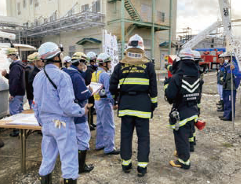 日本曹達の各事業場では、定期的な防災訓練の中で、近隣の工場や自治体と一体になって共同防災訓練を行っています。地域ごとに異なる環境や実態に合わせた災害状況を想定することで、現実に即した内容で防災訓練を実施しています。